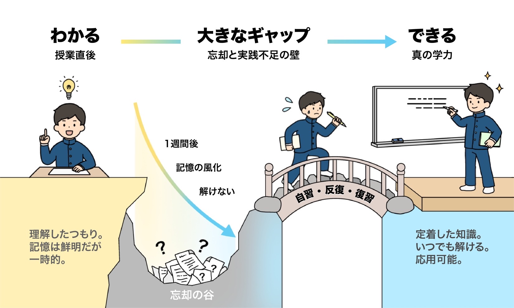「わかる」は学校や塾の授業を聞いて、理解できるということ。説明を聞けば多くの生徒は「わかった」という状態になります。授業直後なら、問題が解けることも珍しくありません。